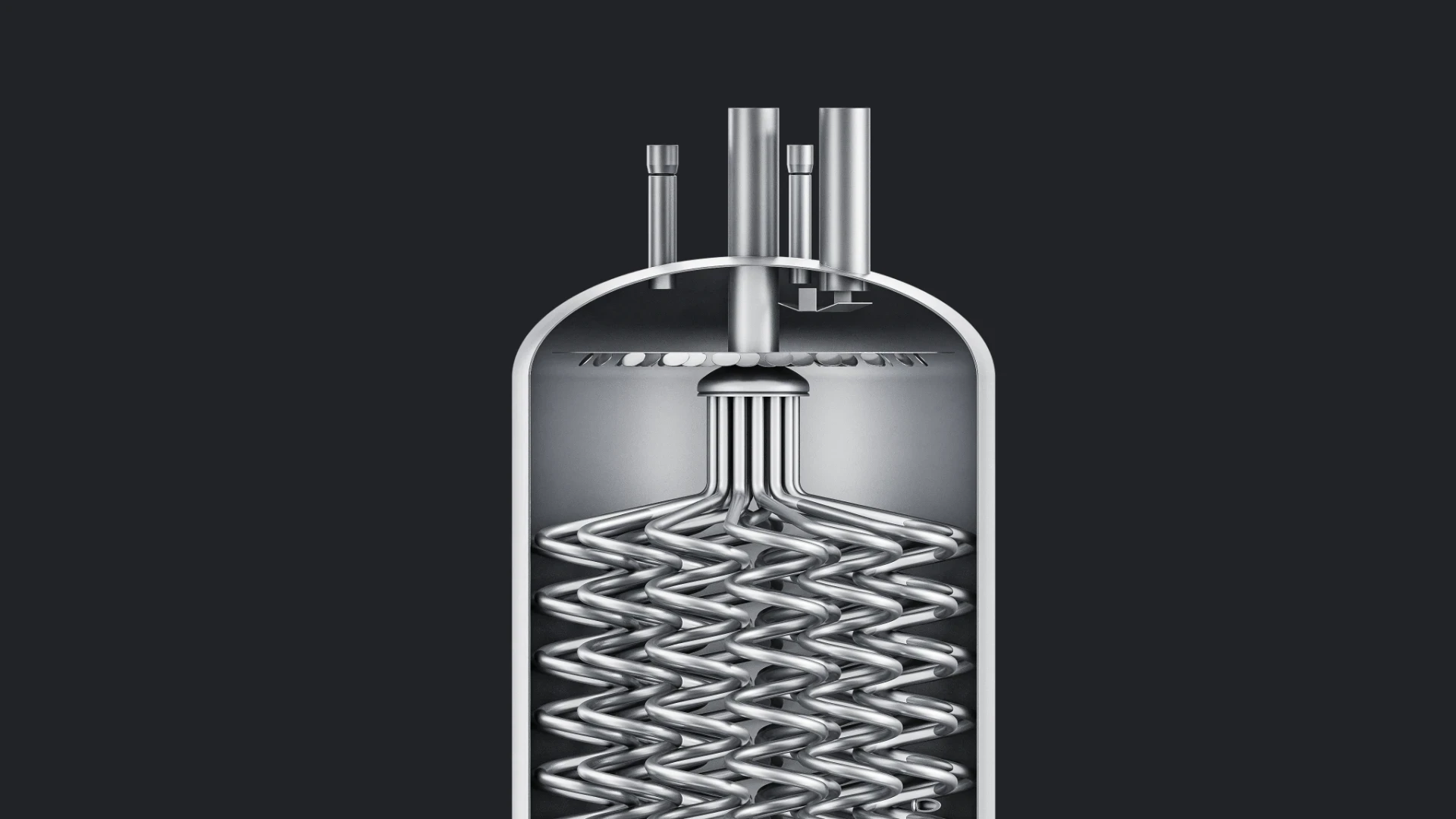 Instead of a single coil, we designed multiple smaller coils connected into a single, highly efficient heat exchanger. This configuration allows the coils to fill almost the entire volume of the tank, forcing the fluid in the shell side to flow between the tubes. As a result, we achieved a very large heat transfer area while using small-diameter tubes.